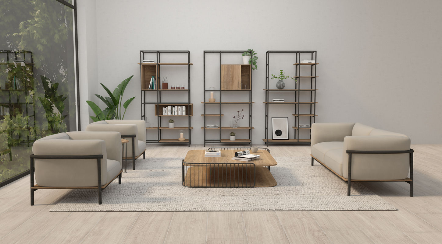 Cada pieza está diseñada para espacios residenciales y comerciales, fabricada con procesos de alta calidad: soldadura experta, pintura electrostática y detalles en melamina o madera que garantizan durabilidad y un acabado sofisticado.
